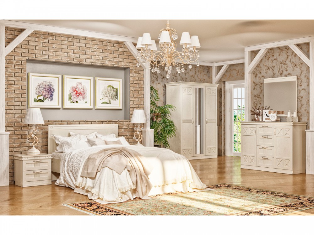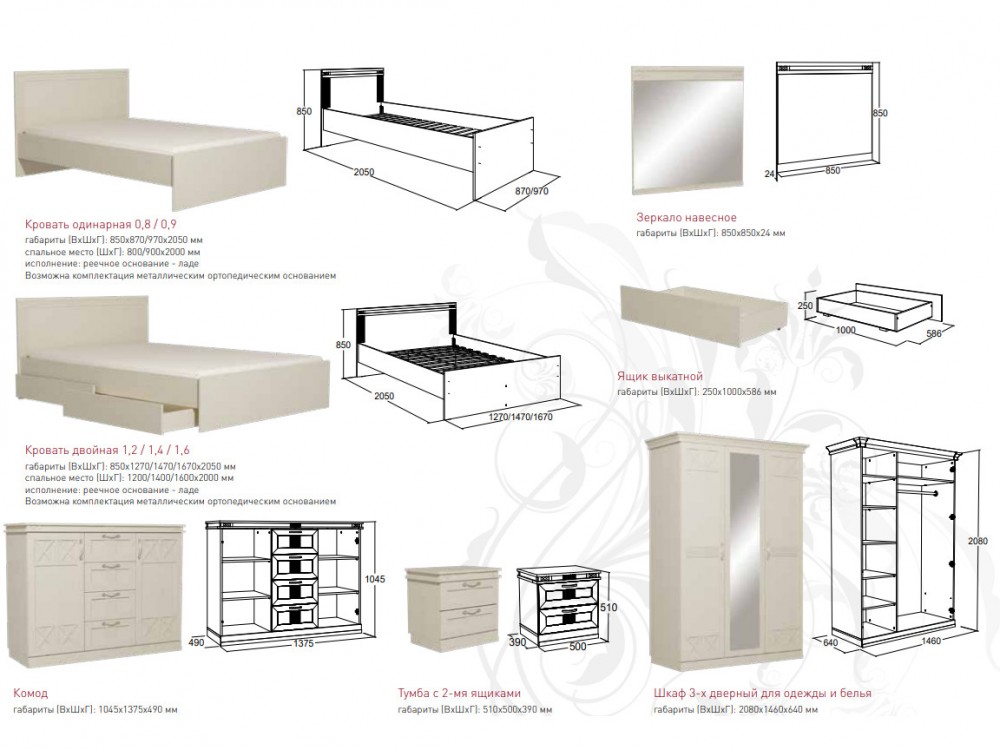 Цена указана за комплект: зеркало, комод, кровать двойная 1,2, шкаф 3-х створчатый, тумба с 2-мя ящиками