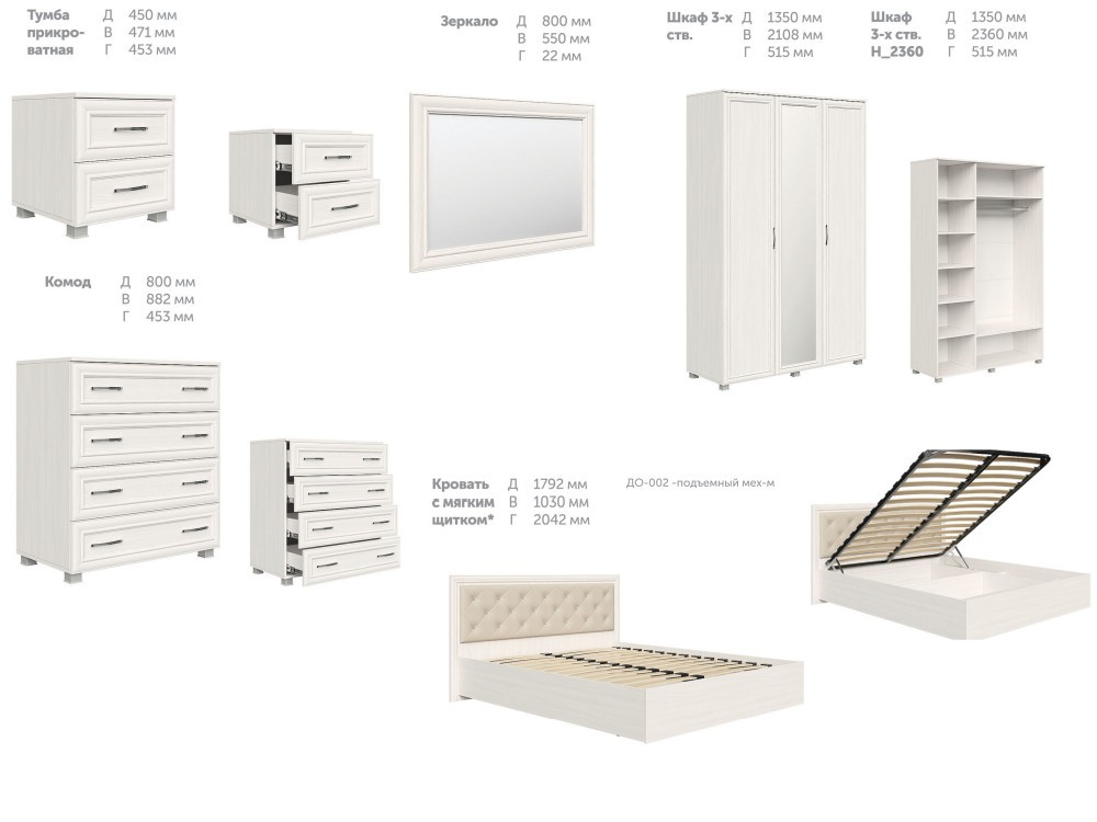 Цена за комплект: Зеркало, Комод, Шкаф 3х створчатый ШК-006, Кровать 1,6 м с мягким изголовьем (с ортопедом), Тумба прикроватная ТМ-009 - 2 шт