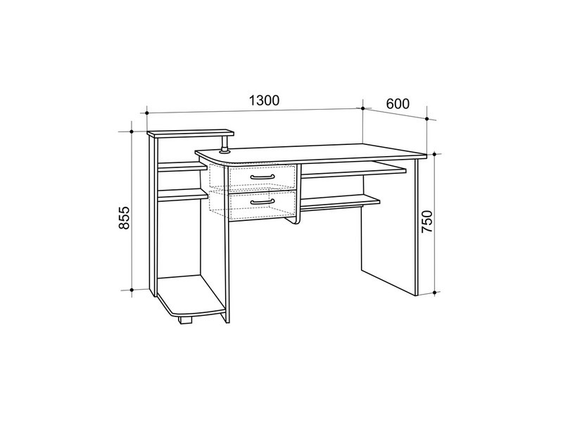 Состоит из: стола, 2 выдвижных ящиков, выдвижной панели для клавиатуры, полок. Сборка на одну сторону (монитор справа).